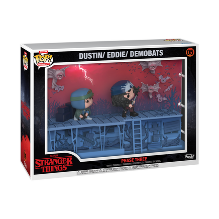 Hawkins, Indiana ospita segreti pericolosi e soprannaturali. Preparati per una resa dei conti elettrizzanti con Eddie e Dustin mentre si preparano ad affrontare il Demobats a colpi di rock! Questo modellino Funko POP replica l'iconica scena della fase tre della 4 stagione di Stranger Things.