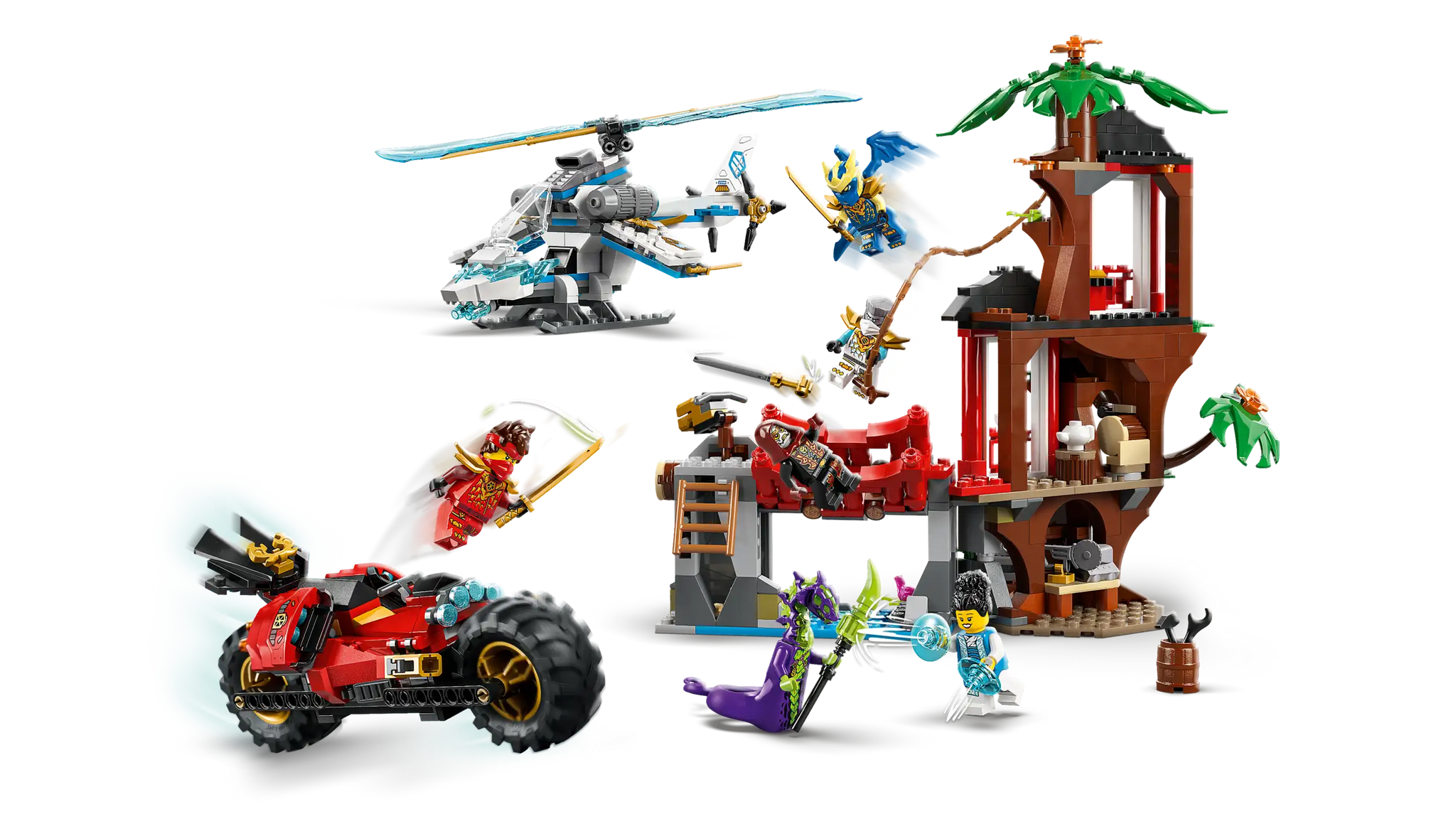 Riporta in vita l'azione della stagione 4 di NINJAGO® La rivolta dei draghi con questo set costruibile epico! La casa sull'albero a 3 piani offre infinite possibilità di gioco: officina, sala da tè, terrazza, rampicante oscillante, trappola a roccia, ponte girevole e shooter. Completo di elicottero, motocicletta con ruote mobili e 6 minifigure, questo playset è perfetto per bambini dai 7 anni in su che amano le battaglie avventurose. Costruisci, combatti e immagina nuove storie ogni giorno!